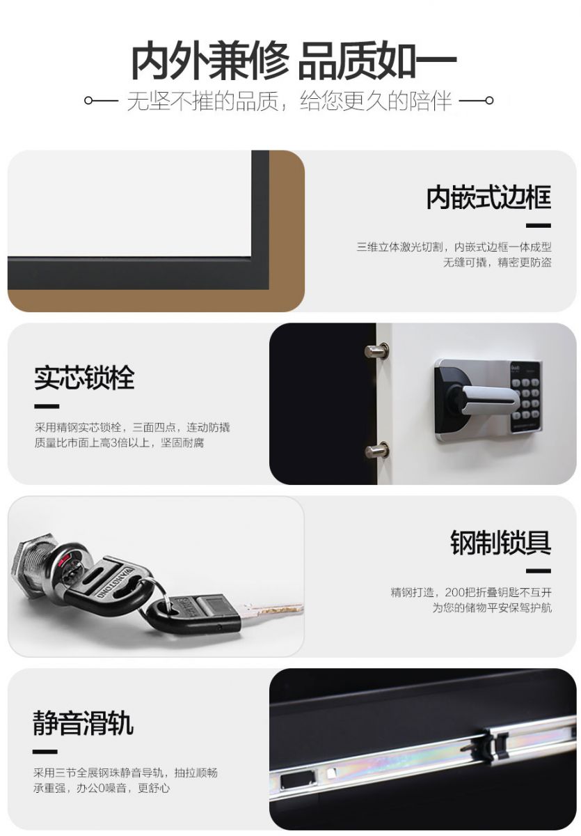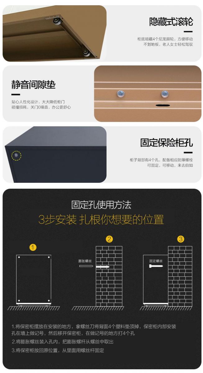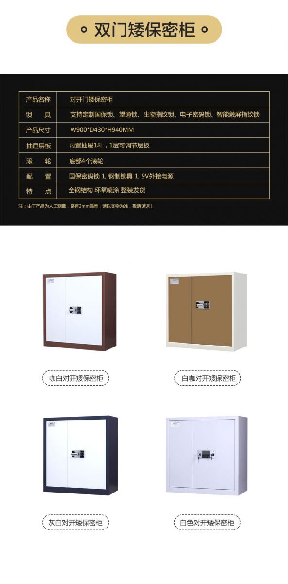 品牌:嘉瑞麦 规格:高940mm*宽900mm*深430mm 特点: - 选用上海宝钢一级冷轧钢板,表面光滑,强度高,使用寿命长 - 精选三节钢珠静音滑轨,抽屉可承重40公斤,储物大空间 - 名牌锁具:多款高档电子锁可选,安全有保障,坚固耐磨不褪色